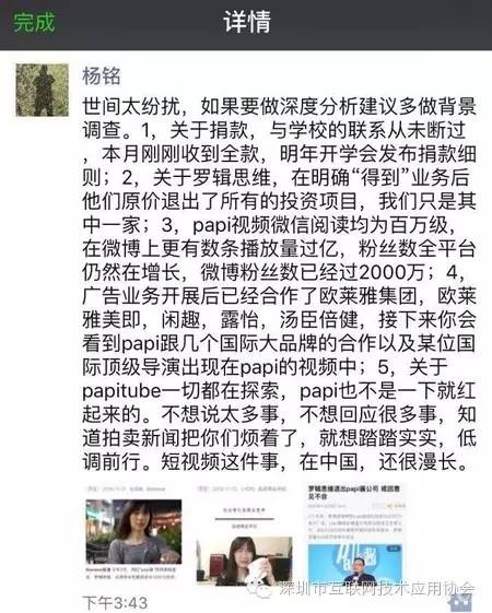 逻辑思维还出了一期节目为Papi酱背书,将对papi酱的投资前前后后都说了出来。