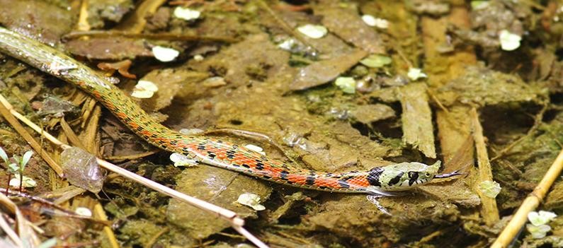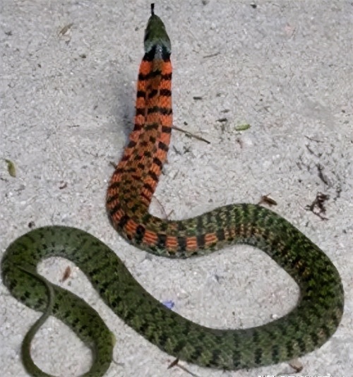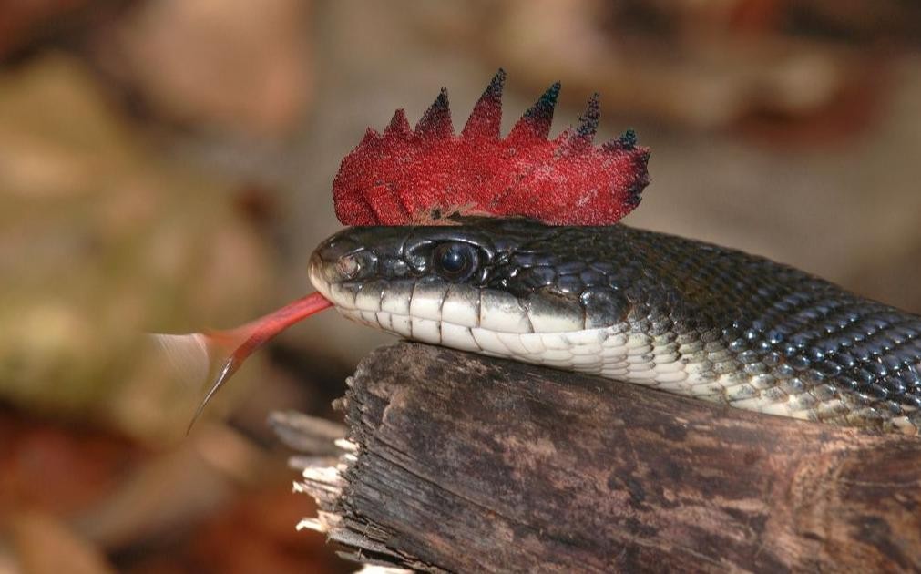 但在现实中,被称为“鸡冠蛇”的原型其实是虎斑游蛇。这种蛇的背部有一条红色花纹,当它受到威胁时,这条红色花纹会像鸡的鸡冠一样竖起。