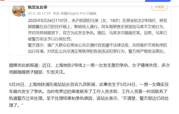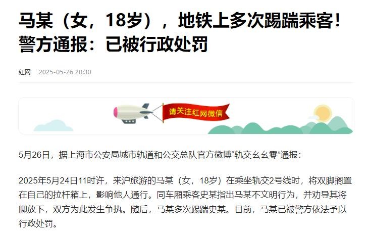 信息来源:红网2025-05-26马某(女,18岁),地铁上多次踢踹乘客!警方通报:已被行政处罚