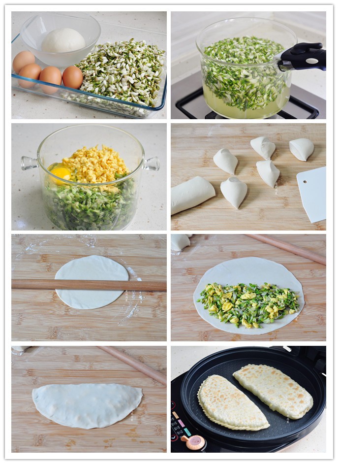 盒子馅料:洋槐花400克(焯烫后),鸡蛋4个,花生油3勺,盐6克