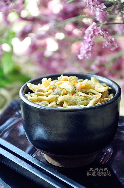 6.蒸好后的槐花取出,加蒜泥、盐和辣油,调拌均匀即可食用。