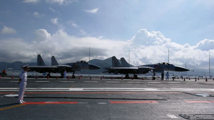 上到飞机甲板最先进入眼帘的是这两架歼15飞鲨舰载机