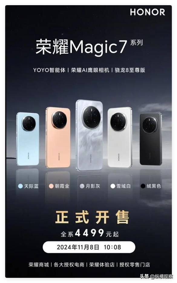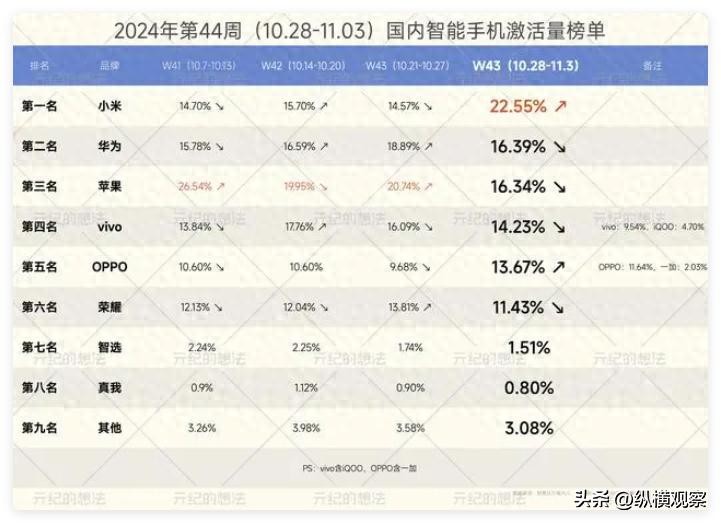 排名第六的是荣耀,它的市场份额为11.43%,作为横向对比,上周的市场份额为13.81%。成绩下跌的原因有两个:其一是本周友商有好几款旗舰新机开售,这对荣耀手机的销量会有明显的影响。其二是荣耀Magic7系列首销日不在本周,而是在11月8日(W45),所以荣耀的爆发时刻在下周,而不是本周。