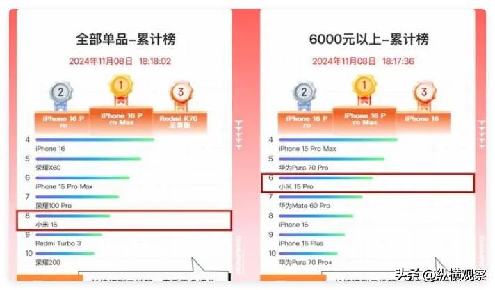 排名第一的是小米,它的市场份额为22.55%,称呼其黑马的原因很简单,上周的市场份额为14.57%。成为黑马的原因也很简单,小米15系列首发时间是10月31日,实话实说知道小米15系列会爆,但是万万没想到会爆这么高。除了线下市场,京东竞速版也能看出一些端倪:在总竞速榜中,小米15打败了红米Turbo3排名第八。小米15在4000-5999元价位段排名第一,小米15 Pro在6000元以上价位的排名第六。
