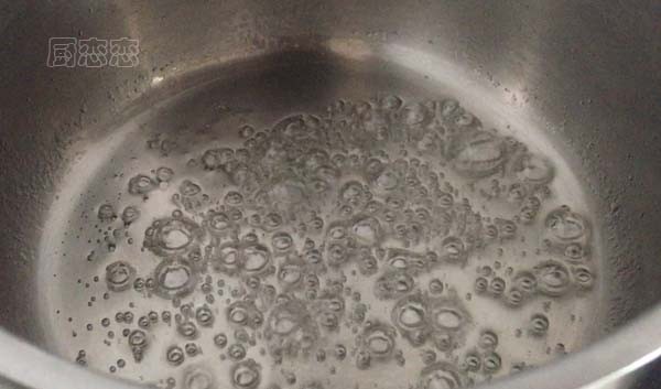 3、50克水加30克糖放奶锅里,用小火煮至翻小泡,糖浆变稠关火(操作这一步的时候全程都要开小火,因为量比较小,很容易会烧糊掉。如果担心自己又打蛋清又熬糖浆忙不过来的话,可以先把打好的蛋清放一边,再熬糖浆,打好的蛋清放一下没有关系,但是熬好的糖浆就很容易凝固)