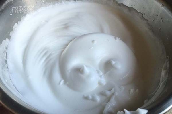 4、把熬好的糖浆加入到打发的蛋白里,边搅拌边倒,注意糖浆不要滴在盆壁或者打蛋器上,以免糖浆结块,影响后期使用;打好后放一边备用
