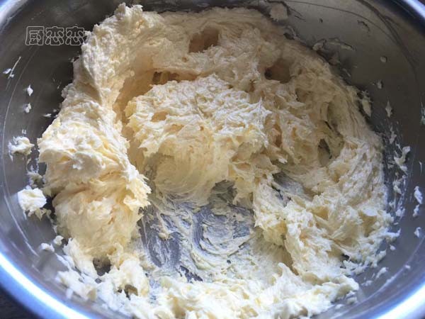 1、软化的黄油用打蛋器搅打至发白,放一边备用