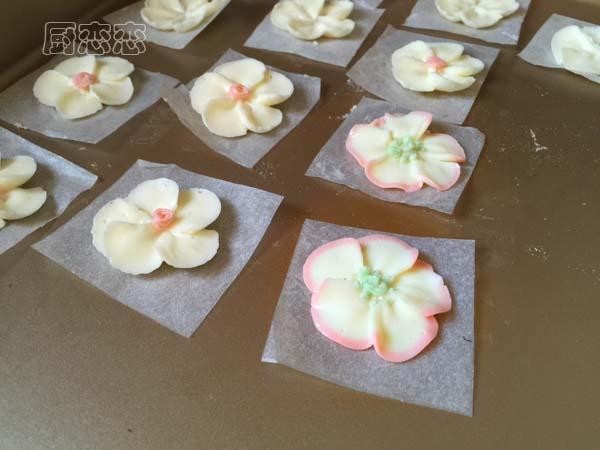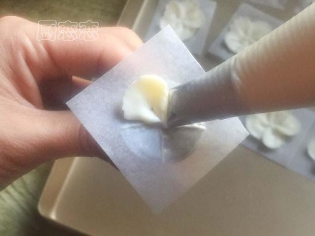 12、裱好花瓣后可以用1号花嘴点缀花蕊,全部裱完需要的花朵之后把他们放进冰箱里冻硬