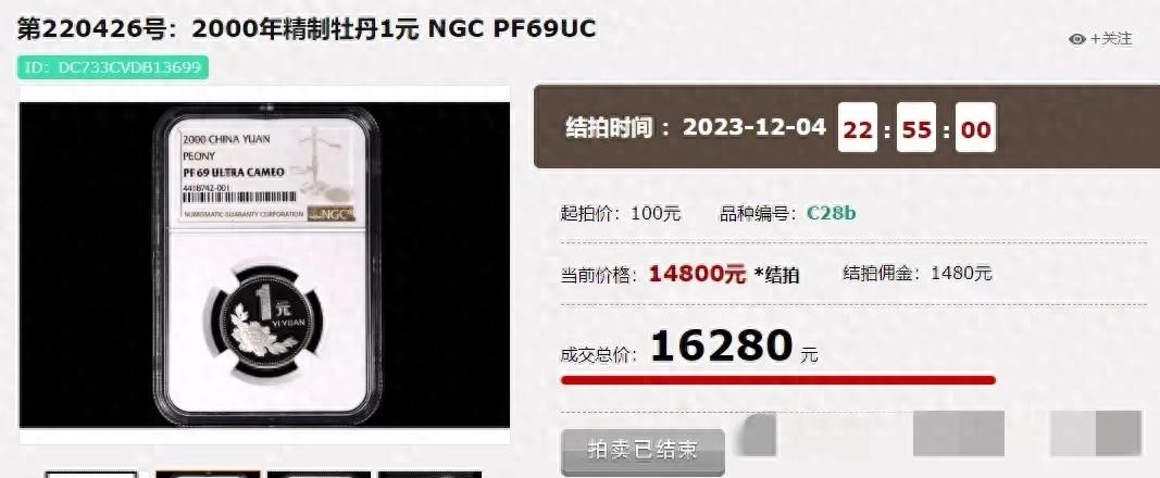 牡丹一元拍卖价1.62万人民币!是的,你没看错,一枚牡丹一元2000年精制币,评级分数高达69分,拍卖成交价1.62万元。