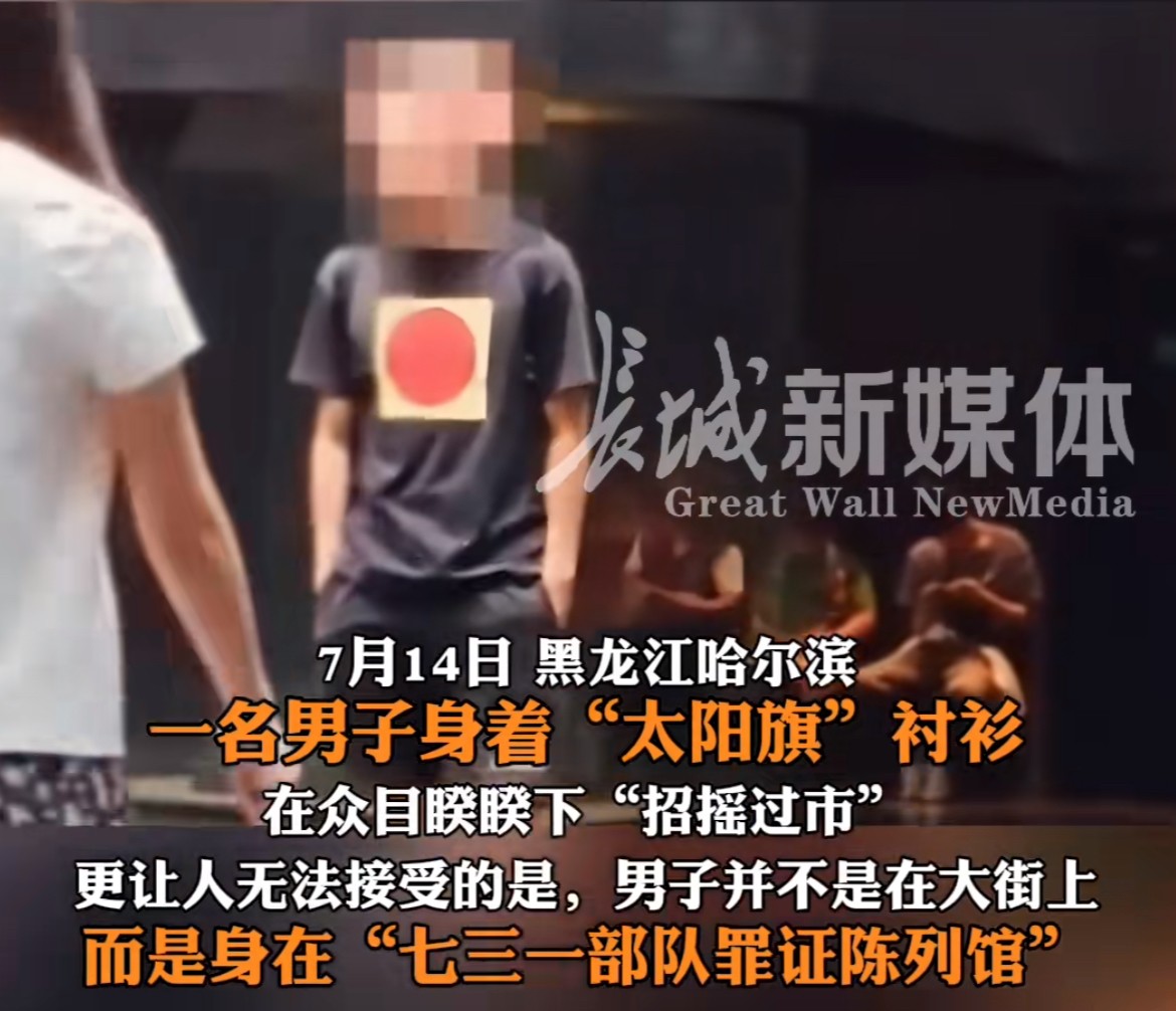 一名穿黑衣的男子大摇大摆在731部队罪证陈列馆里游荡,让人感到气愤的是,他身着黑衣服的中间,竟然印着个白底圆红的图案,跟日本的太阳旗很相像。从他双手插兜摇头晃脑的动作来看,他明显就不是前来参观的,而更可能是前来捣乱的。