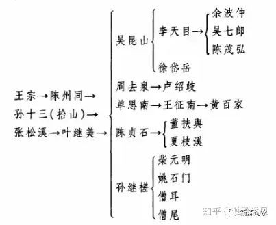 以上人物,史料记载有详有略,也有的仅为一人名。如《王征南墓志铭》仅记王宗是早期陕西内家拳的著名传人,此外别无资料。但材料记明清时盛传于浙东的内家拳最初是由北而来,自有迹可寻。唐豪《内家拳》中就曾指出:北方人称拳为“锤”(或捶),内家拳的六路歌诀中就有“煞锤冲掳两翅摇”的“煞锤” ,当为“北地方言”。陈州同情况同样不明,万言的《张松溪传》仅言其为“弘正间”人,跟随王宗习练内家拳。但正是由于他“以此教其乡人”并传于陈州同,遂使内家拳在浙东地区流传开来,从这个意义,上讲,陈州同是使内家拳在该地区传播的关键性人物。另如孙十三老,亦仅知其为“大梁街人,性粗戆”,早年在温州学拳于陈州同,但正是由于他,才使内家拳在浙东四明得以传播,并发展至张松溪、王征南时,内家拳在武林界独树一帜,翕然天下。