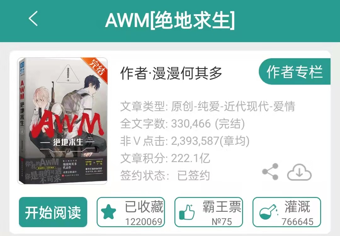 ①:《AWM【绝地求生】》作者:漫漫何其多 推荐指数: