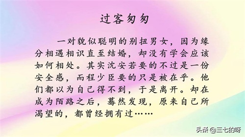 男主和女主都是在感情中敏感又小心翼翼的,爱情面前,两人都存了几分不约而同地退却,男主理性克制,了然于心,却隐忍不发,女主更胆怯,他和她都做好了在感情中抽身而退的翩翩风度。
