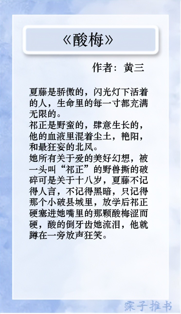 简评:《酸梅》这部小说的题材很新颖,讲述一个五线小明星夏藤遭遇网络暴力后需要改变自己的生活环境,来到乡下外婆家,希望在这个小村镇中调整心情,安然度日,但碰见了小镇的大混混,两人在相互交往中暗生情愫。