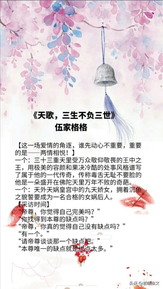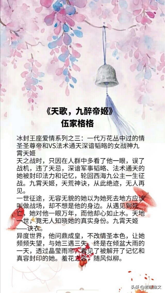 推荐理由:一代万花丛中过的情圣圣尊帝和 VS 法术通天深谙韬略的女战神九霄天姬天之战时,伍家格格的第三本天歌系列,依然不会让人失望,作者的文笔超好的,这篇语言有点幽默,但是在感情上描写的很好,从初遇,到喜欢上,到三遇三失,不过最后还是在一起了。