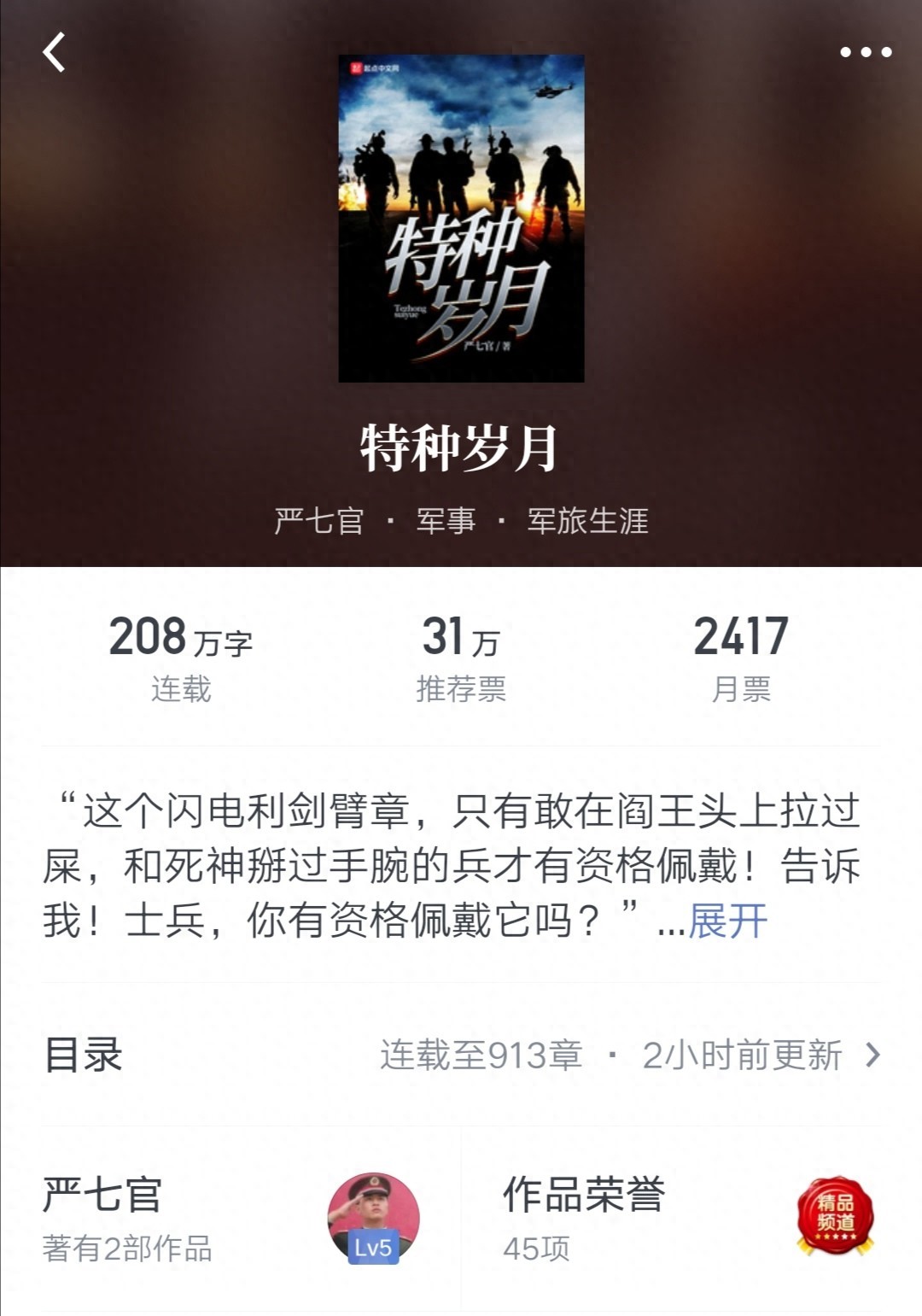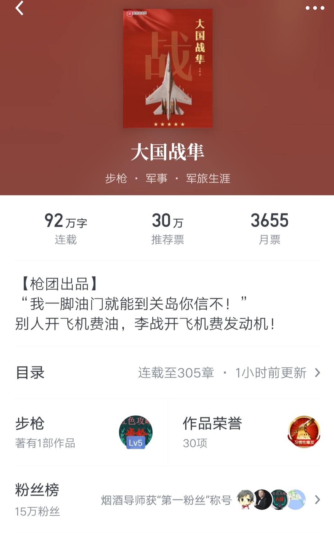 这部小说是军事类的爆款,从2018年火到2019年的爆款。常居军事月票榜第一位,就在最近才被另一佳作拉了下来。