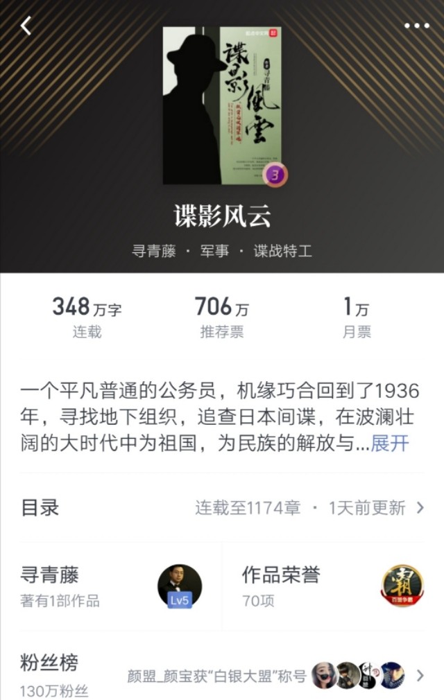 从第二名开始,月票数就呈现一个质的飞跃。《谍影风云》又名《民国谍影》寻青藤之作。