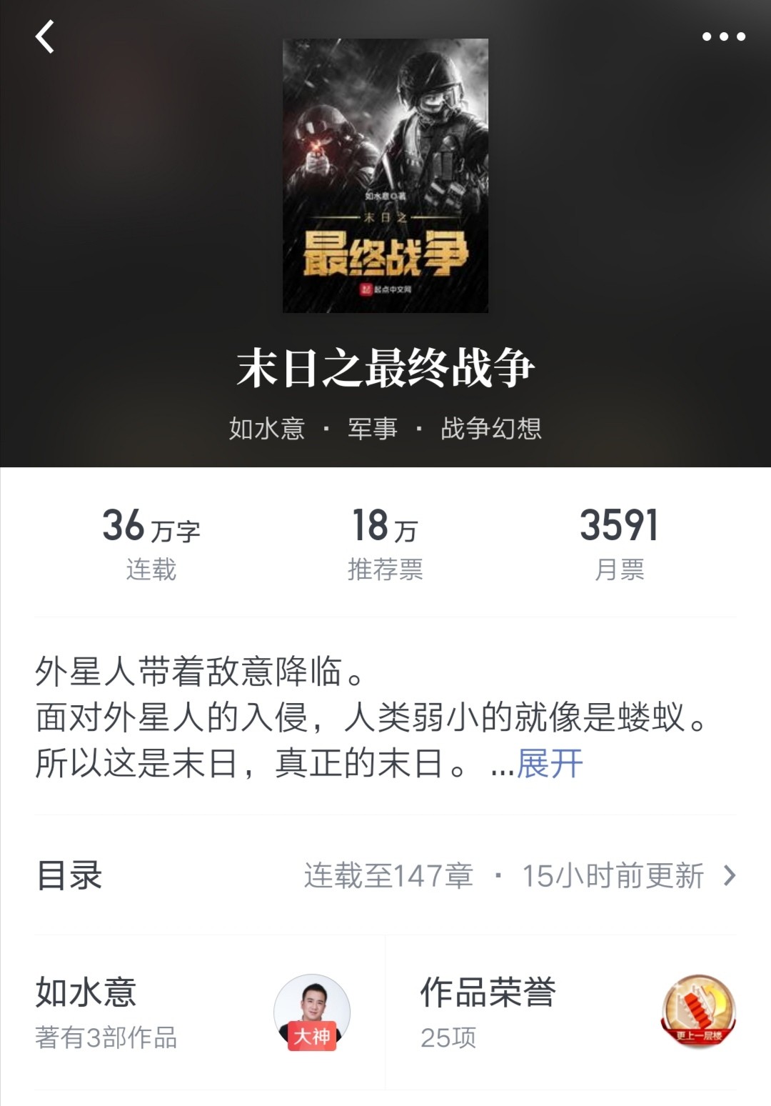 如水意大神的新书,讲的是外星文明入侵的战争。