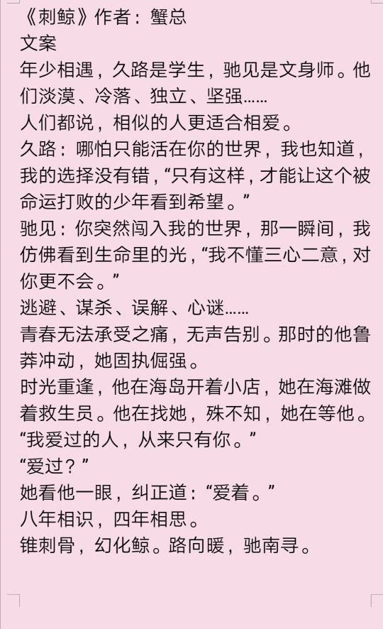 痞帅纹身小哥VS漂亮伪乖少女,久别重逢,有小包子的文。女主是一个把疯狂乖张都压抑在克制的外表之下的人,什么情绪都压在心里的性格,男主是打破她重重壁垒走进女主心里的人,很酷,痞帅痞坏。