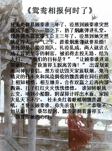 《鸳鸯相报何时了》活泼聪明的女主VS武艺高超风流倜傥男主。阴差阳错男主和女主只能假成亲,基调欢脱,日常搞笑