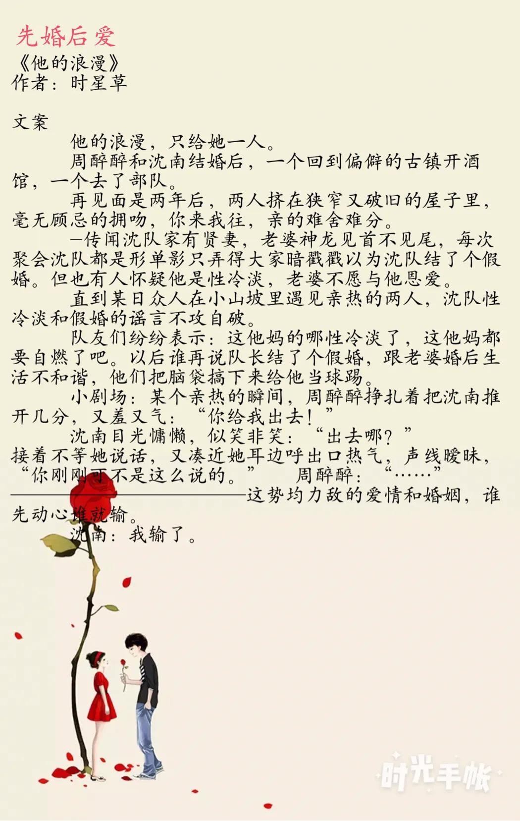 注:《他的浪漫》这本小说还是一个系列文,时星草还有一本小说是说周醉醉女儿的故事,还挺好看的,大家感兴趣的可以看一下(名字忘了,记性不好)。