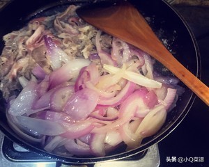 冷锅冷油,放入洋葱丝,煸至变色,煸软,盛出。