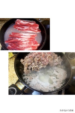 倒入适量开水,放入350克牛肉卷,水沸撇血末,这步不能省。