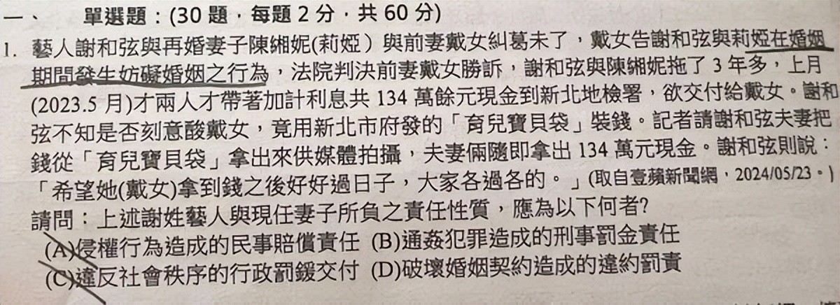 谢和弦对此表示不满,直言:“那个新店高中的公民老师,我有得罪你吗?你怎么不写戴女偷偷约炮晕船人设崩塌?感恩哈们”,公开喊话该出题老师。陈缃妮在底下留言:“我比较好奇上升到教育层面,老师的订正与解题,蛮好奇老师会怎么解释?”并发文称从小到大没看过公众人物原名出现在考卷上。