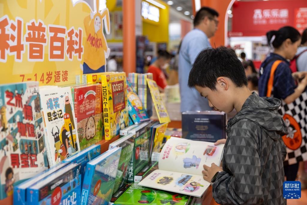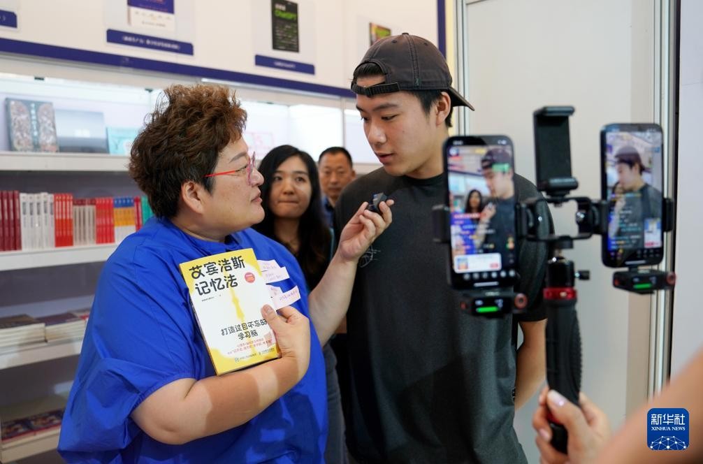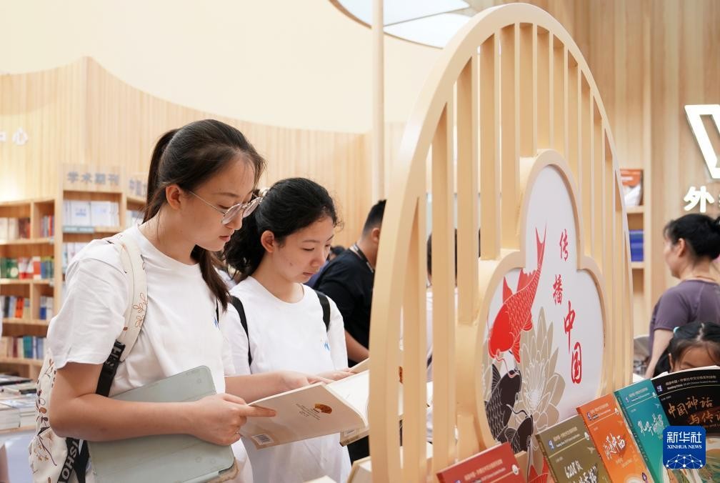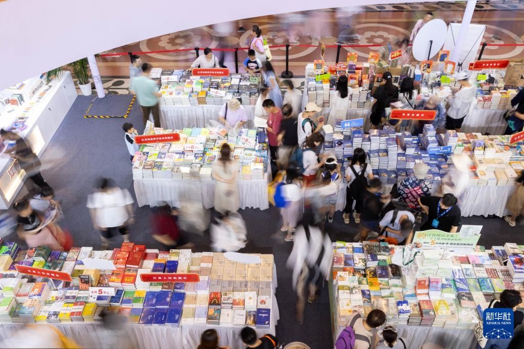 8月14日,人们在新华出版社展位咨询。