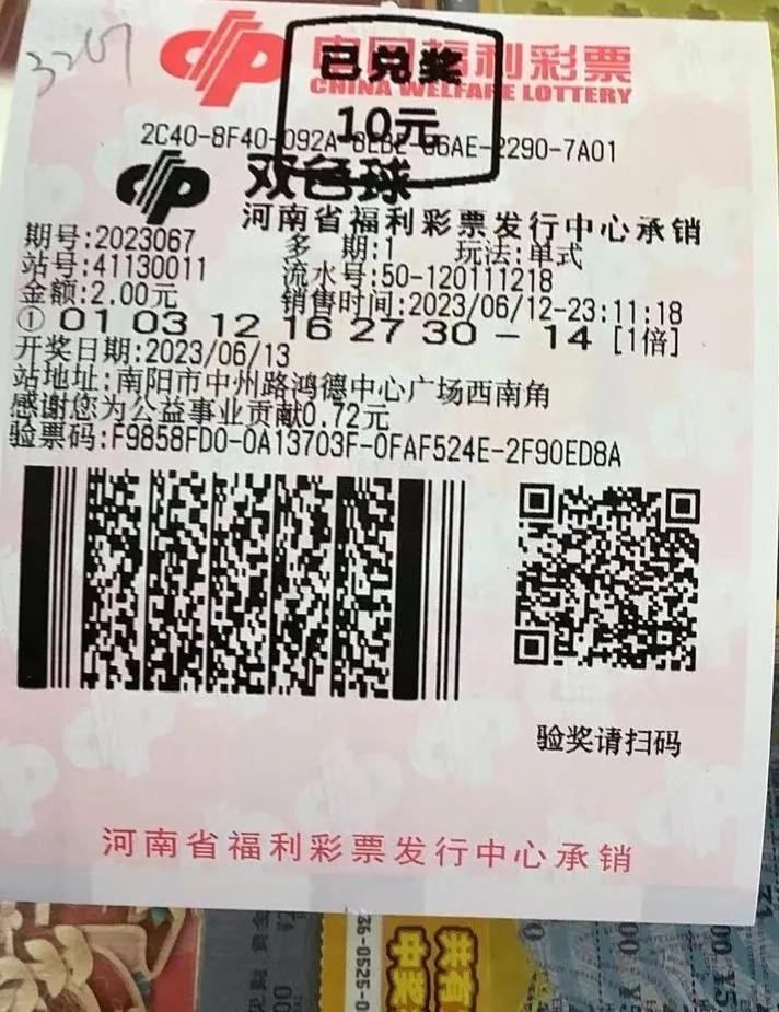 2023年6月13日,双色球开奖中了3+1,兑奖10元,心中好激动。