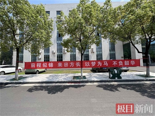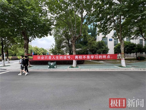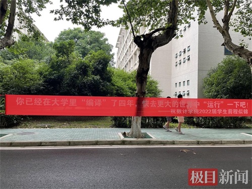 在武汉轻工大学,类似的横幅、标语随处可见,有的抒怀“带最初的心,走最远的路,做最真的自己,过最棒的人生”,有的叮咛“毕业只是人生的逗号,离校不是学习的终点”,有的慷慨激昂,写“前程似锦,来日方长,以梦为马,不负韶华”,有的不忘专业特色,写下“你已经在大学里‘编译’了四年,快去更大的世界中‘运行’一下吧!”