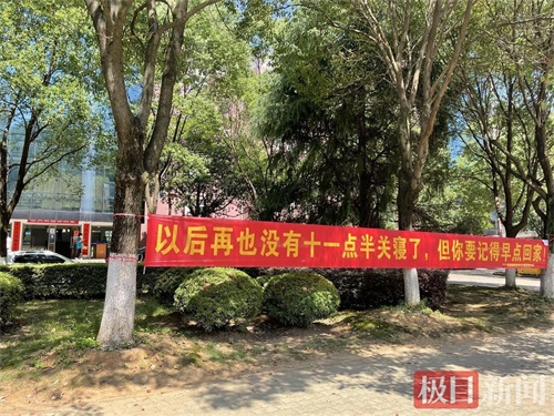 在武汉纺织大学,路边一条标语写着:“以后再也没有十一点半关寝了,但你要记得早点回家!”