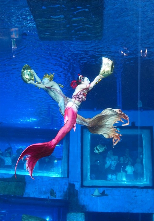 假期在继续,景区内的精彩也在继续。2月1日,在正佳极地海洋世界,为了庆祝新春佳节财神日的到来,在40米宽9米高的海底展缸里,一场水下迎财神美人鱼演出《财神到!冠军美人鱼海底大秀》引来不少游客的围观,现场时不时传来阵阵掌声。此次的水下美人鱼大秀演出团队由美人鱼大赛冠军选手组成。他们都是国内广受好评的美人鱼比赛选手,都有着超群的表演功底,使得这场水下演出更具观赏性。