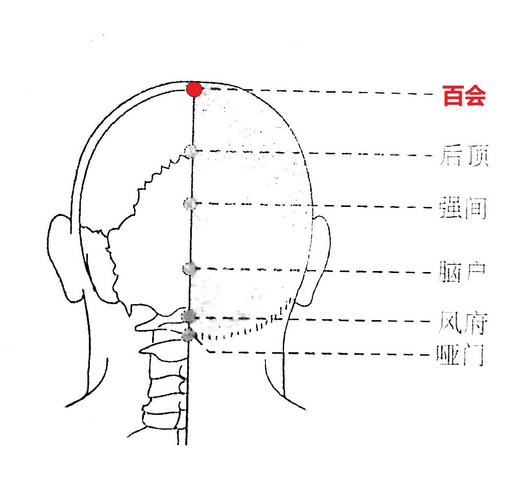 按揉法:用拇指指面按柔百会穴至局部发热,每次3-5分钟。