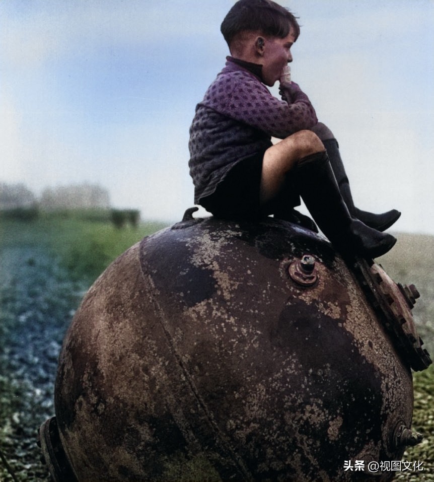 1940年2月,英格兰东海岸,一个男孩坐在一颗水雷上啃食一个冰激凌,当时的孩子们经常把战后武器当作游戏场上的运动器械,并不时发生灾难性的后果。
