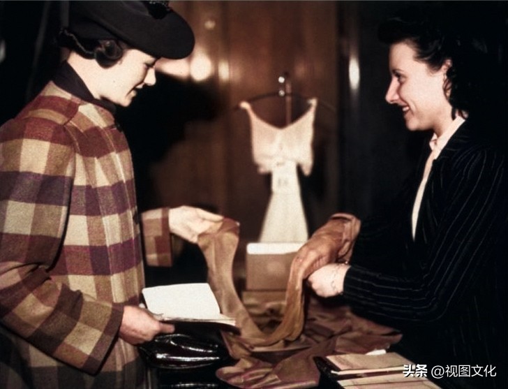 20世纪40年代,伦敦,一名妇女在挑长袜,战后由于物资匮乏,除了食品、汽油等,连服装也开始实行定量供应,因此使得黑市生意大兴其道。