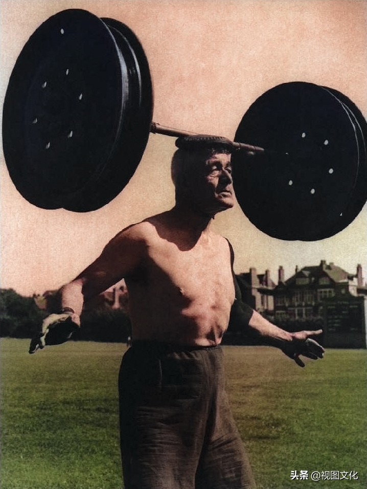 老当益壮,二战期间,这个英国老人已经60岁了,民防队中士,为战争积极锻炼身体,头顶60公斤的杠铃,这是要用头顶死德国人吗?