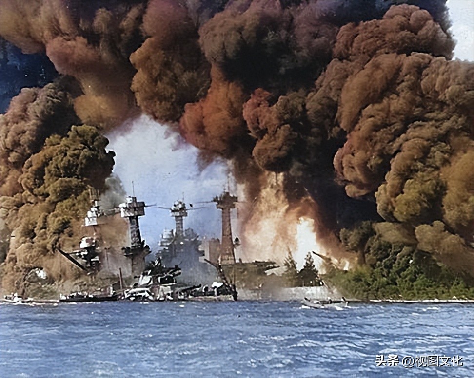 1941年12月7日凌晨(夏威夷时间),珍珠港基地遭到日本大量海空军突袭时的场面,停泊在港内的美国太平洋舰队主力几乎全军覆没。