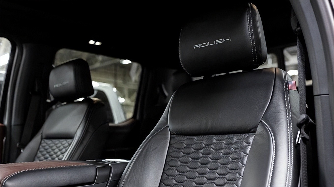 内饰方面,Roush提供了高级真皮内饰选装包,302A XLT配有灰色、黑色双色真皮座椅,502A Lariat底则采用全黑真皮内饰,带有原厂复古胭脂红内饰。两种真皮内饰选项的座椅头枕上都拥有Roush字样刺绣,以及其他彰显Roush品牌的标识和设计。