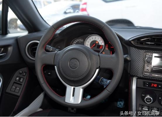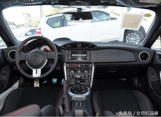 至于内饰方面:主打玩性的丰田86的内饰并没有那么多的讲究,主要是为了突出运动气息,“T”字形的中控台简洁明了,但功能还是很齐全的,自动空调,USB,AUX接口等都有配备。三辐式设计的方向盘,红色缝合线凸显运动气息,握感没的说的,还带有换挡拨片,玩性可谓十足。