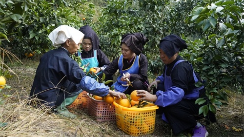 在种植户梁真情家的果林里,她正在和几个工人一起,忙着采摘新鲜的果子送往提前预订好的客户手中。经过几年的精心管理,她家种植的10来亩果冻橙今年带来了不错的收益。