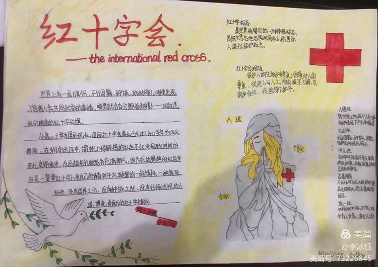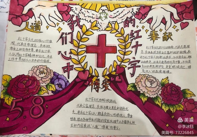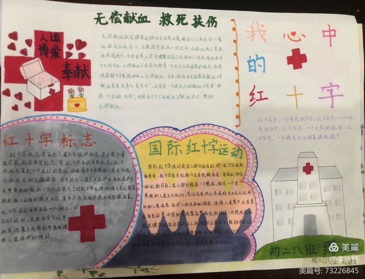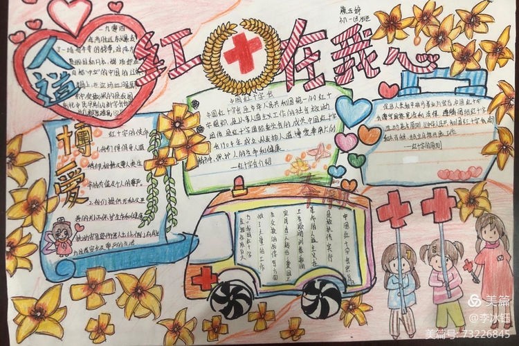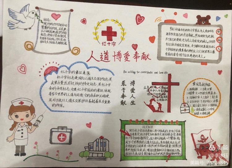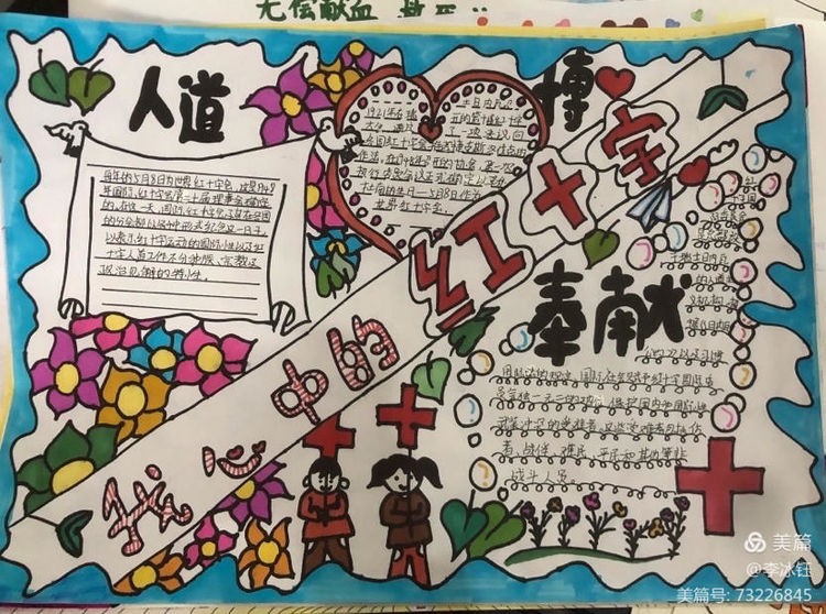 为广泛传播“人道、博爱、奉献”的红十字精神,发挥红十字工作在培养德智体美劳全面发展的社会主义建设者和接班人中的积极作用,引导广大青少年坚定不移听党话、感党恩、跟党走,涵养高尚情操,培养红十字会青少年关爱他人的思想品德和人道主义精神,广泛传播红十字文化,促进学校德育教育和校园文化建设。区红十字会在区二中举办了红十字青少年手抄报竞赛活动,同学们积极踊跃参与其中,涌现了大量的优秀作品。