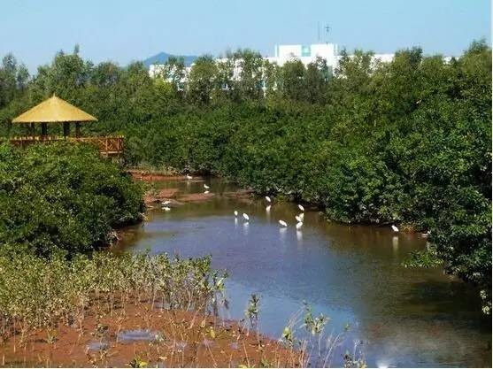 红树林公园,园内有观景平台、廊架、观鸟亭以及长约800米的生态栈道,亲水活动区中有南岸滨河生态观景带、观景亭、文娱舞台以及桥头休闲公园。