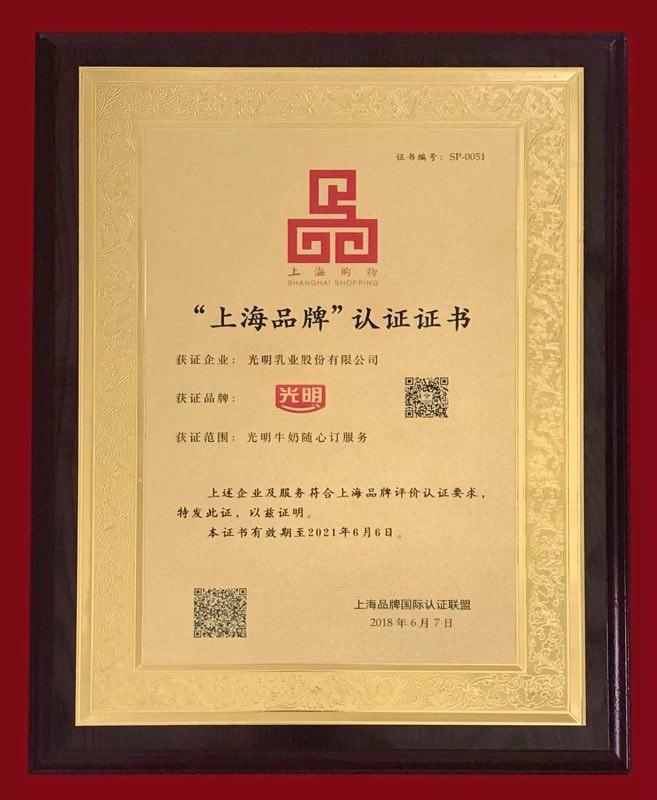 光明乳业随心订获2018年首批“上海品牌”认证