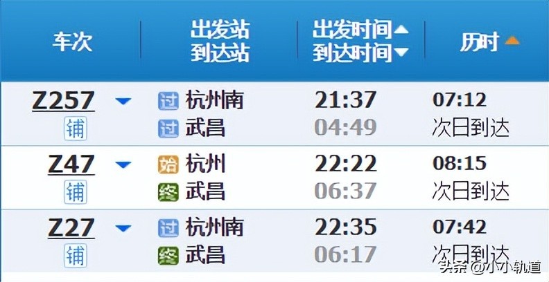 目前,杭州至武汉每天有3个班次直达特快列车。其中,Z27次列车用时最短,用时为7小时42分钟;Z47次列车是唯一的,始发终到站列车。