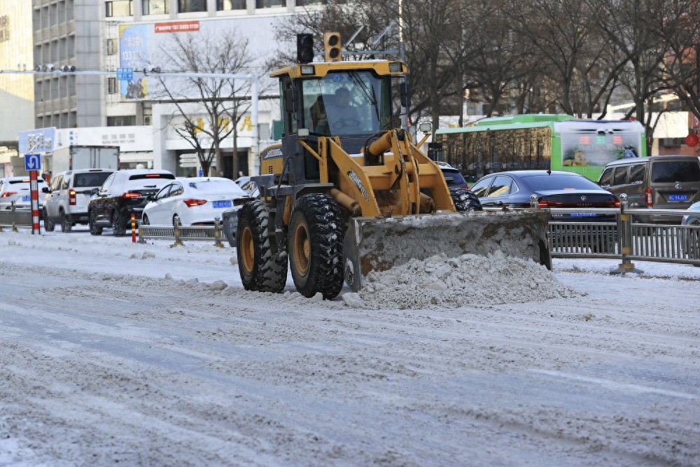 12月15日,在河北省秦皇岛市,一辆工程车在清扫路上积雪。新华社发(王寒植摄)