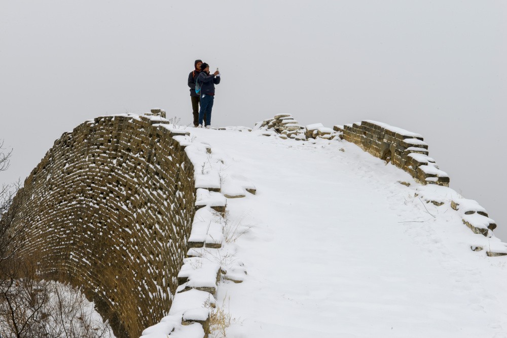 12月14日,游人在河北承德金山岭长城踏雪游玩。新华社发(周万平摄)