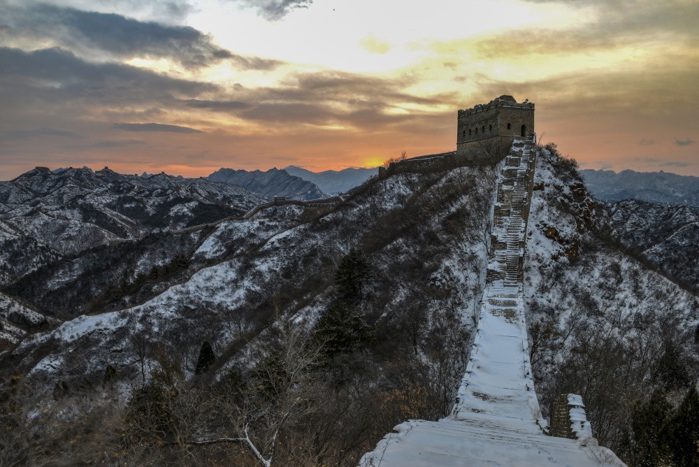 12月15日在河北承德金山岭长城拍摄的朝霞下的长城雪景。新华社发(周万平摄)