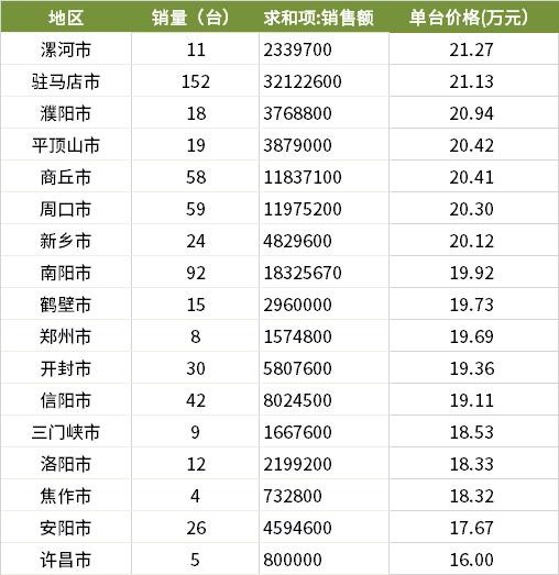 结合销量来看,销售最多的驻马店市,以152台的优异成绩笑傲群雄,而21.13万元的均价也属于河南地区均价最高区域之一,难道真的是需求决定价格??如果是这个原因的话,销售了92台的南阳市均价也比驻马店市便宜了1.21万元。42台的信阳市均价更低至了19.11万元,差价更是都达到 2万元,1-2万多的差价!这在农村来说可能是一个家庭全年的种植收入了。