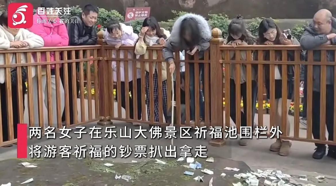 2025年1月23日,乐山大佛这一世界闻名的文化遗产和佛教圣地,迎来了一件令人咋舌的事件。在乐山大佛脚下的祈福池,两名年轻女子竟然用棍子专挑100元面额的钱币,将他人用来祈福的钱财公然拿走!这一行为不仅引发了现场游客的强烈不满,也让这座承载着无数人信仰与期许的圣地蒙上了一层阴影。
